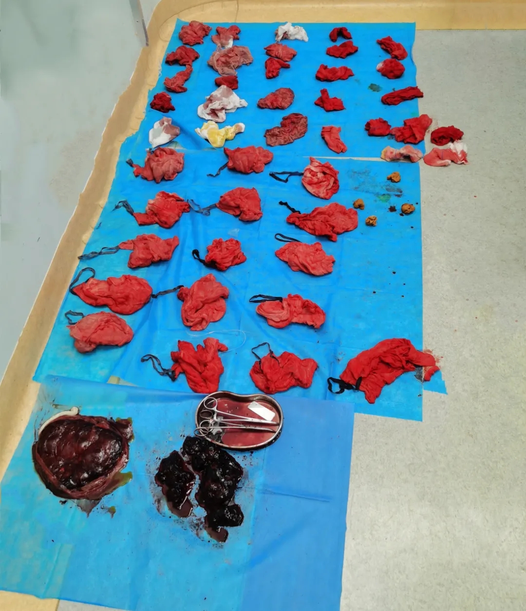 緊急與家屬溝通病情并簽署知情同意書后,李女士被迅速推入手術室,實施全身麻醉。婦產(chǎn)科賀芳主任醫(yī)師帶領王丹醫(yī)生、劉倩醫(yī)生快速把李女士子宮內(nèi)的胎兒、胎盤取出,此時胎盤后方能看到大量的積血和積血塊。同時,賀芳主任醫(yī)師發(fā)現(xiàn)李女士的子宮表面呈紫藍色,子宮軟如布袋,宮腔胎盤剝離面出血不止。“正常的子宮表面是粉紅色的,而像這種子宮呈現(xiàn)紫藍色狀態(tài),我們醫(yī)學稱為子宮胎盤卒中,像這么嚴重的還是很少見的。把胎兒取出后,患者凝血功能很差,子宮切口和胎盤剝離面一直在出淡紅色不凝血,無凝血塊形成。”