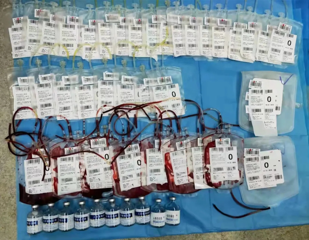 一瓶瓶纖維蛋白原、冷沉淀凝血因子,一袋袋血漿、紅細胞、血小板,源源不斷地輸入患者體內(nèi)。在手術室和檢驗科之間、手術室和輸血科、手術室及藥房之間,工作人員一次次往返著,將一瓶瓶搶救生命的藥物、一袋袋搶救生命的血制品,送到手術室……