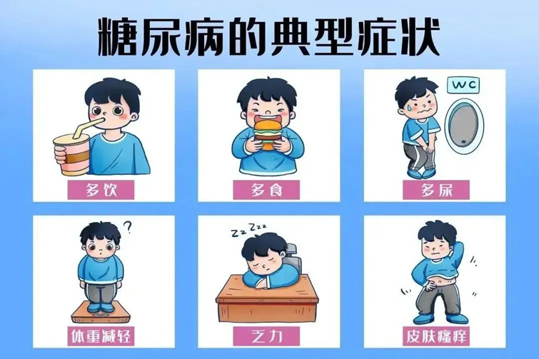 典型癥狀:“三多一少”——多飲、多食、多尿,體重減少。